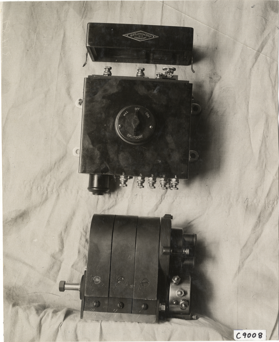 View of Splitdorf magneto for car. Handwritten on back: "Electrical--Splitdorf magneto, 1908."