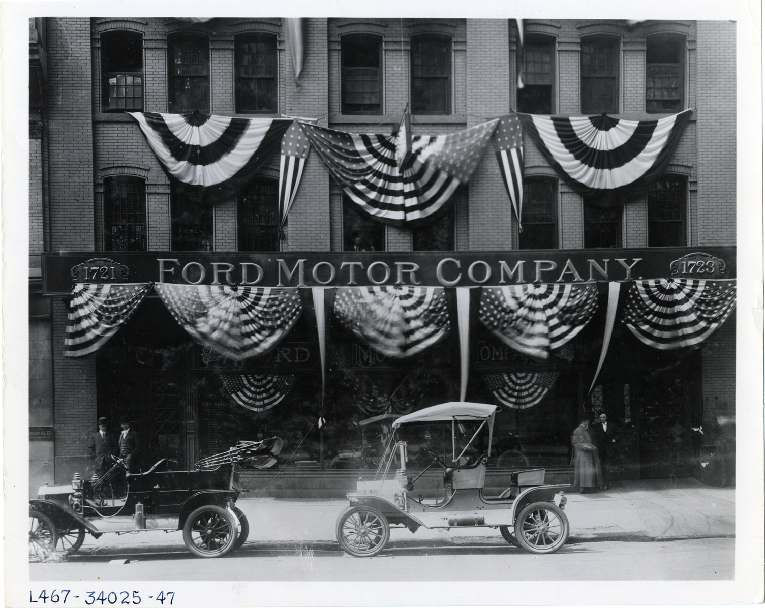 View of Ford Motor Company dealership, decorated with bunting. Cars parked in front of building. Typed on back: "Cars in front of Ford Motor Company, showroom, 1721-23 Broadway, New York City, with carnival decorations. Circa 1909." Handwritten on back: "Dealerships--Ford. Ford showroom, B'way, 1909."