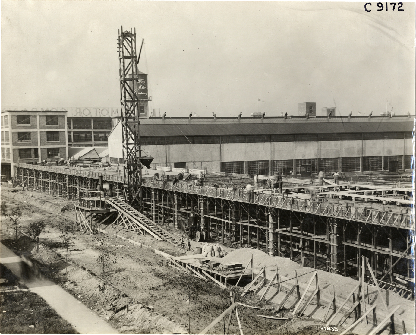 View of Ford Motor Company factory addition during construction; construction workers stand atop of building framework. Factory building and water tower in background. Handwritten on back: "Factories--Ford Motor Co., 1911."