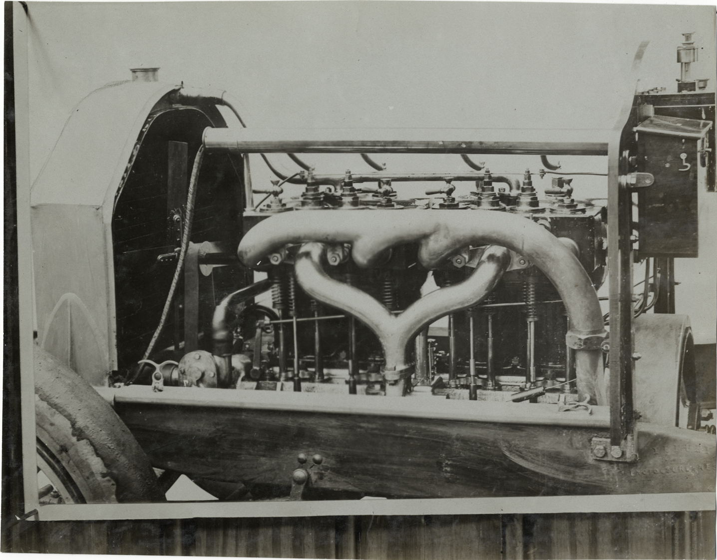 View of car engine. Stamped on back: "Photo by F. Ed. Spooner, 1536 B'way, telephone 6536-38th St., New York, N.Y." Handwritten on back: "Engines--Unidentified, 1906."