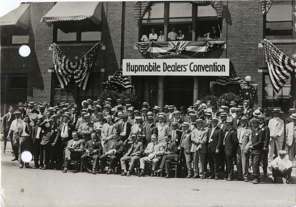 Hupmobile dealers posing in front of Hupp Motor Car Company factory during convention