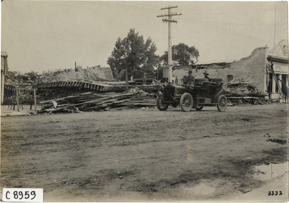 Motorists driving past damaged buildings in San Jose, 1906 San Francisco earthquake and fire