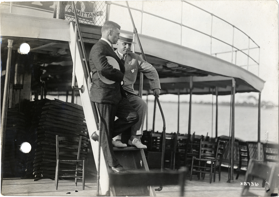 View of two men standing on ladder on ferry during Hupmobile Dealers' Convention; deck chairs stacked in background. Handwritten on back: "Dealerships--Hupmobile. Hupmobile Dealers' Convention."