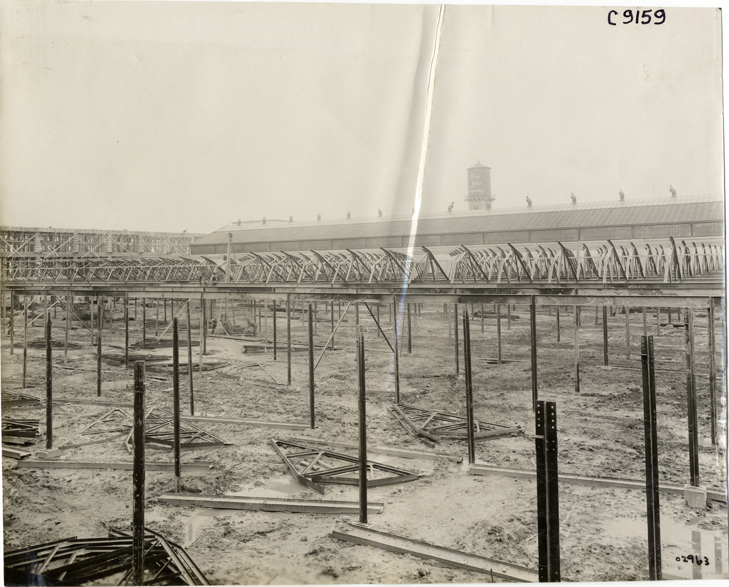 View of Ford Motor Company factory addition during construction; "Ford Motor Company" on water tower in background. Handwritten on back: "Factories--Ford Motor Co., 1911."