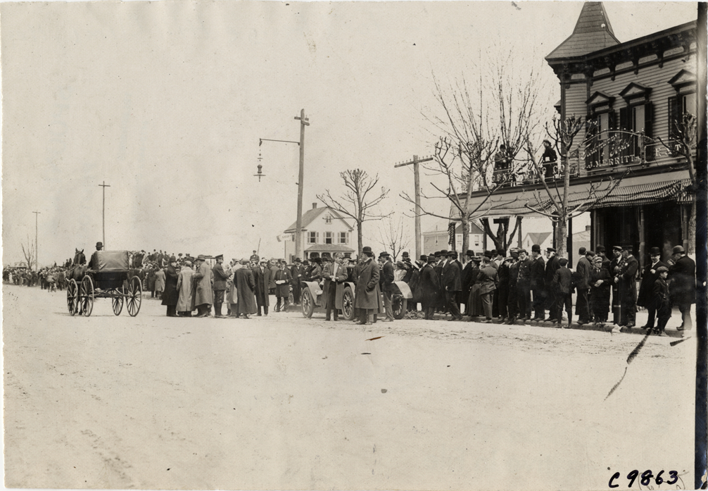 Spectators and automobile in front of Tiedemann's Hotel, 1909 Fort George Hill Climb