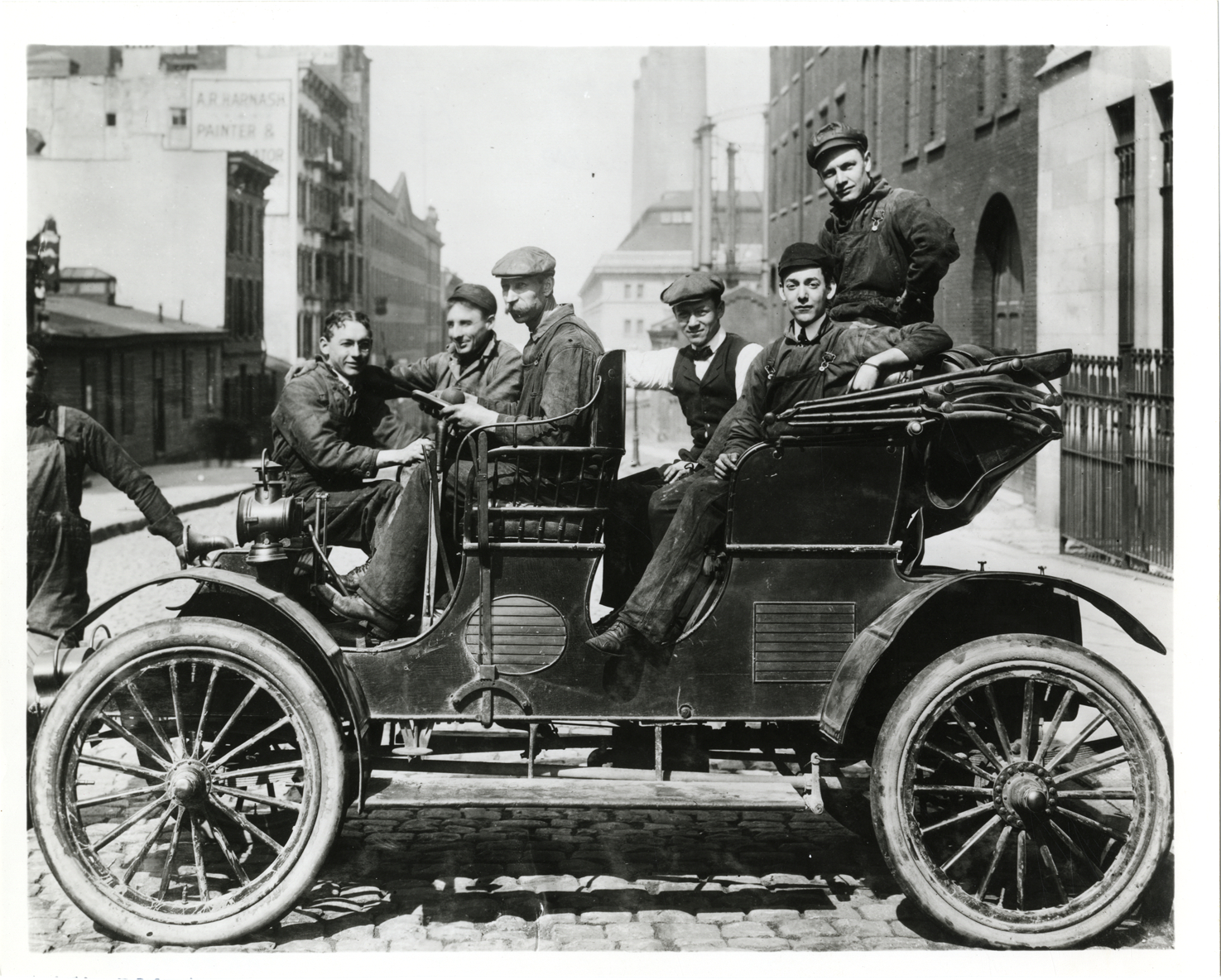 View of several men posing in 1900 Haynes car. Handwritten on back: "Haynes, 1900."