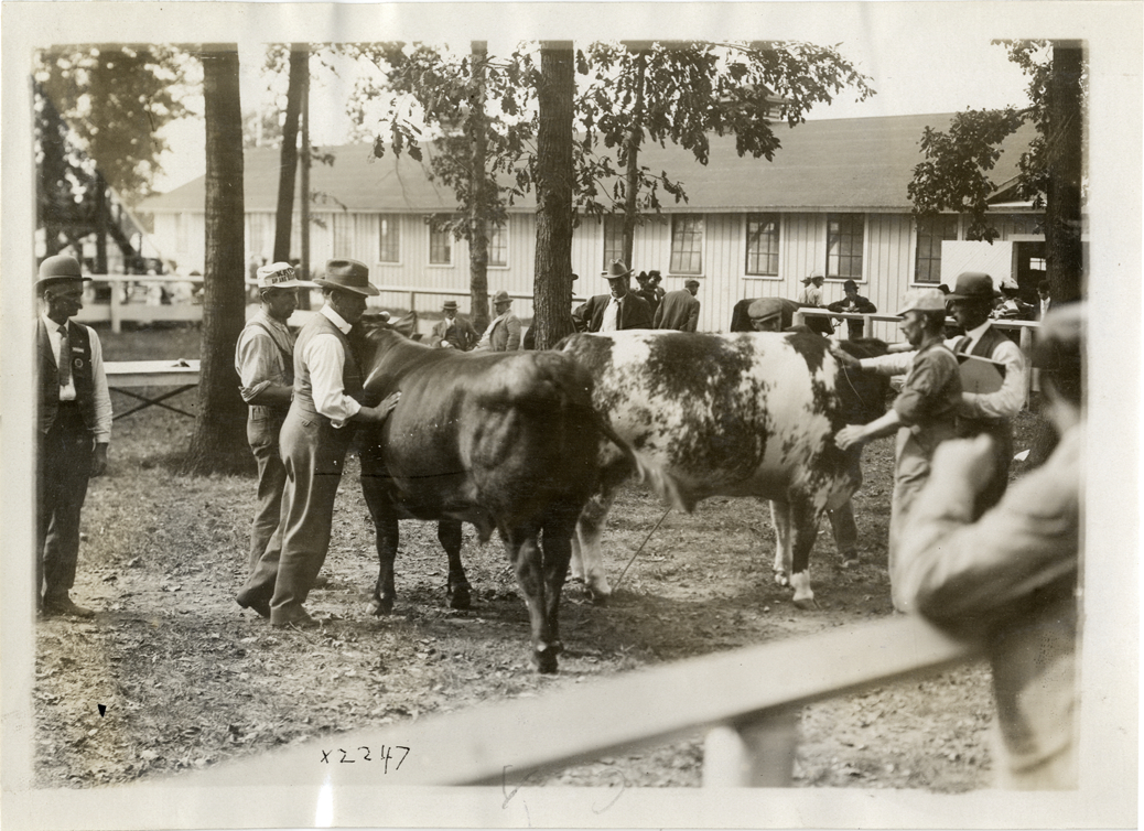 View of judges examining cows at Michigan State Fair. Handwritten on back: "Fairs--Michigan State Fair, 1910."
