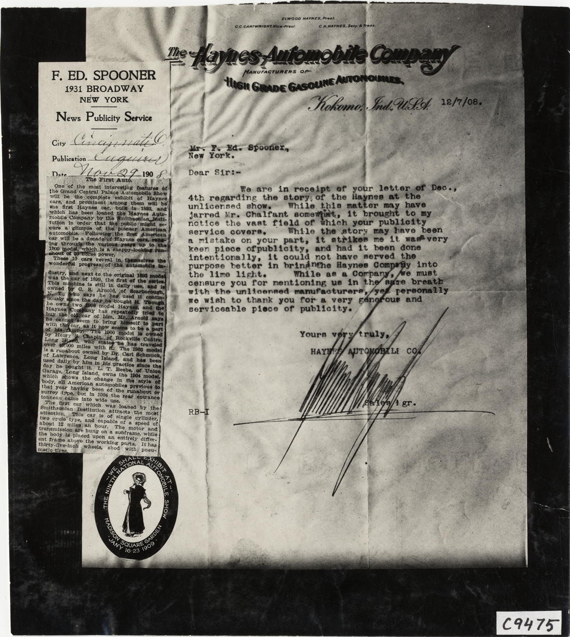 View of letter to F. Ed. Spooner from sales manager at Haynes Automobile Company, dated December 7, 1908, thanking him for his letter regarding the newspaper story of the Haynes car at an unlicensed show. Also included is a newspaper clipping from the Cincinnati Enquirer, dated November 29, 1908, regarding the Haynes cars at the Grand Central Automobile Show. Handwritten on back: "Haynes, 1908, publicity."