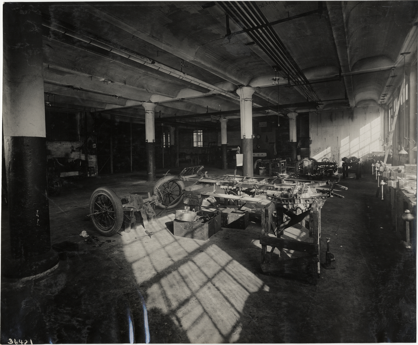 View of interior of Motor Car Repair Company, showing automobile chassis and parts. Stamped on back: "Spooner & Wells, Inc., photographers, telephones 3472-3473 Columbus, 1931 Broadway, New York." Handwritten on back: "Garages, Motor Car Repair Co., New York, 1910."