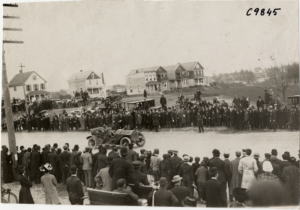 View of spectators watching racecar at 1909 Fort George Hill Climb in New York, New York. Houses in background. Stamped on back: "Spooner & Wells, Inc., photographers, telephones 3472-3473 Columbus, 1931 Broadway, New York." Handwritten on back: "Hill Climbs--Fort George, 1909."
