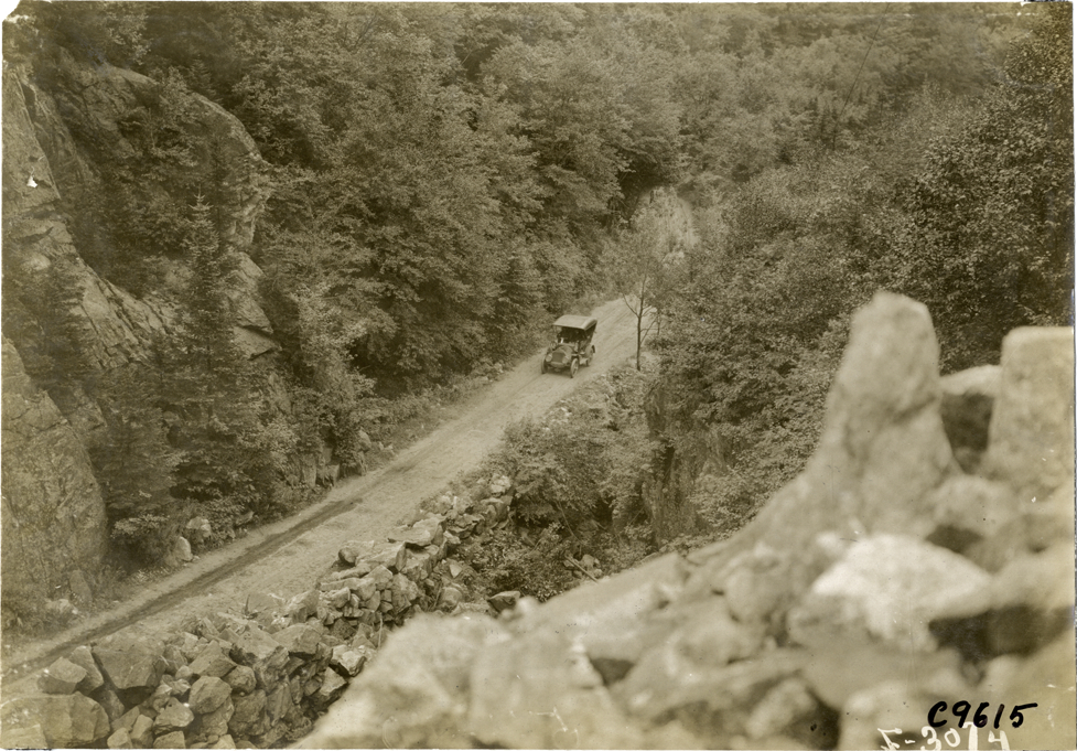Bird's-eye view of car traveling on road during 1906 Crawford Notch Hill Climb in New Hampshire. Handwritten on back: "Hill Climbs--Crawford Notch Hill Climb, 1906."