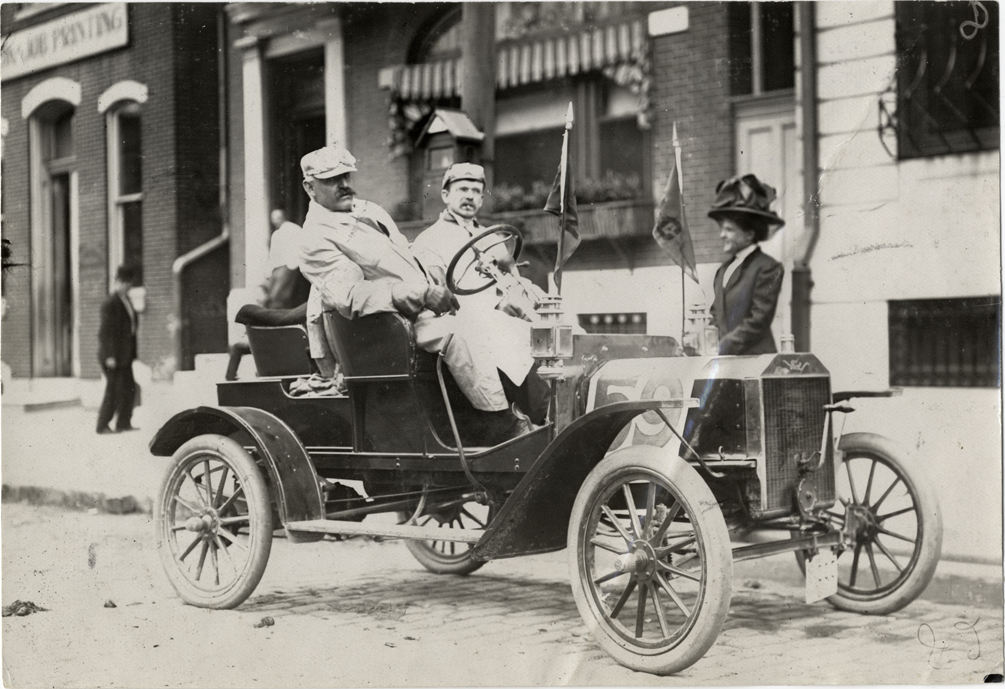 View of driver and passenger in 1907 Ford car; "59" painted on hood of car. Woman stands on sidewalk in background. Stamped on back: "Spooner & Wells, Inc., photographers, 1231 Woodward Ave., Detroit, Mich., telephone North 1745." Handwritten on back: "Ford, ca. 1907."
