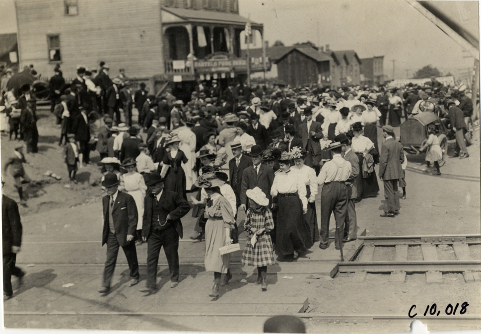 View of spectators at 1909 Giant's Despair Hill Climb in Wilkes-Barre, Pennsylvania. Railroad tracks in foreground. Handwritten on back: "Hill Climbs--Giant's Despair Hill Climb, 1909."