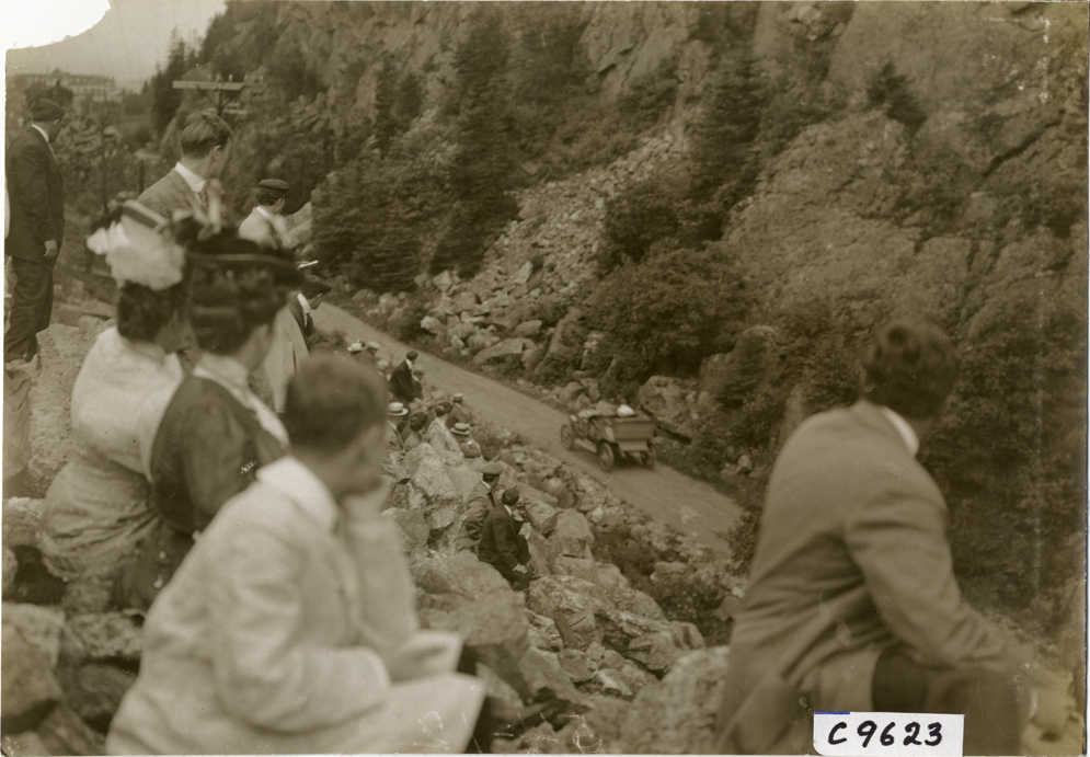 Spectators watching automobile, 1906 Crawford Notch Hill Climb