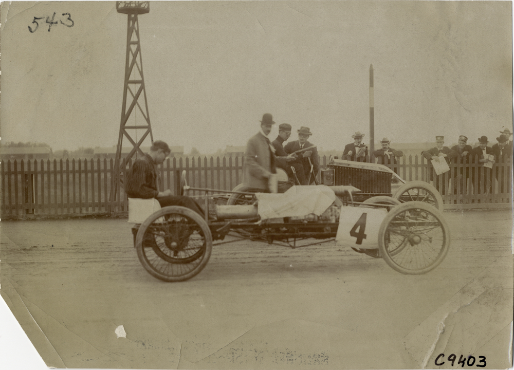 View of Frank Kulick driving 1904 Ford no. 4 racecar. Handwritten on back: "Ford, 1904. #4 racer driven by Frank Kulick."