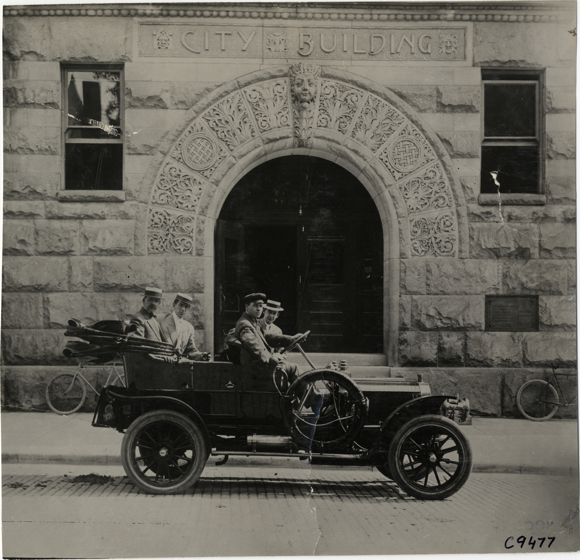 View of four men in 1908 Haynes car, parked in front of arched doorway of Richardsonian Romanesque style City Building. Handwritten on back: "Haynes, 1908."