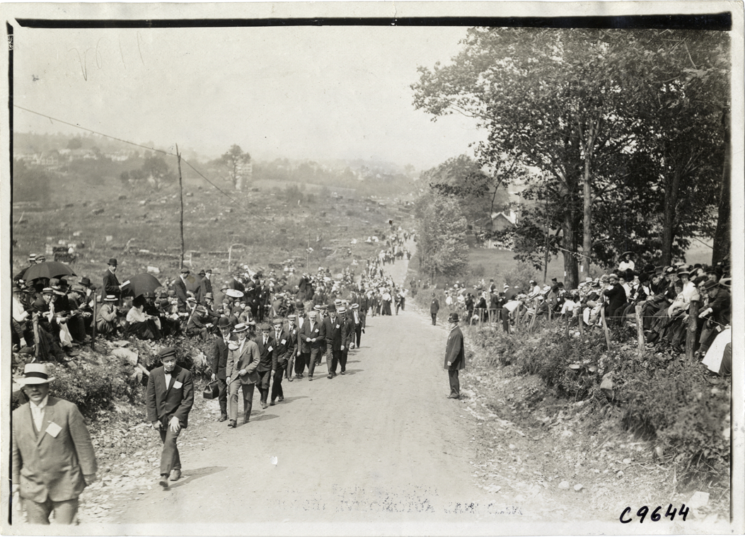 View of spectators along road at 1909 Dead Horse Hill Climb in Worcester, Massachusetts. Stamped on back: "Spooner & Wells, Inc., photographers, telephones 3472-3473 Columbus, 1931 Broadway, New York." Handwritten on back: "Hill Climbs--Dead Horse Hill Climb, 1909. Looking down hill from halfway up. Worcester Hill Climb."