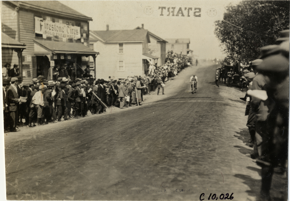 View of spectators watching motorcycle approaching starting line at 1909 Giant's Despair Hill Climb in Wilkes-Barre, Pennsylvania. "Start" banner suspended over road. Stamped on back: "Spooner & Wells, Inc., photographers, telephones 3472-3473 Columbus, 1931 Broadway, New York." Handwritten on back: "Hill Climbs--Giant's Despair Hill Climb, 1909."