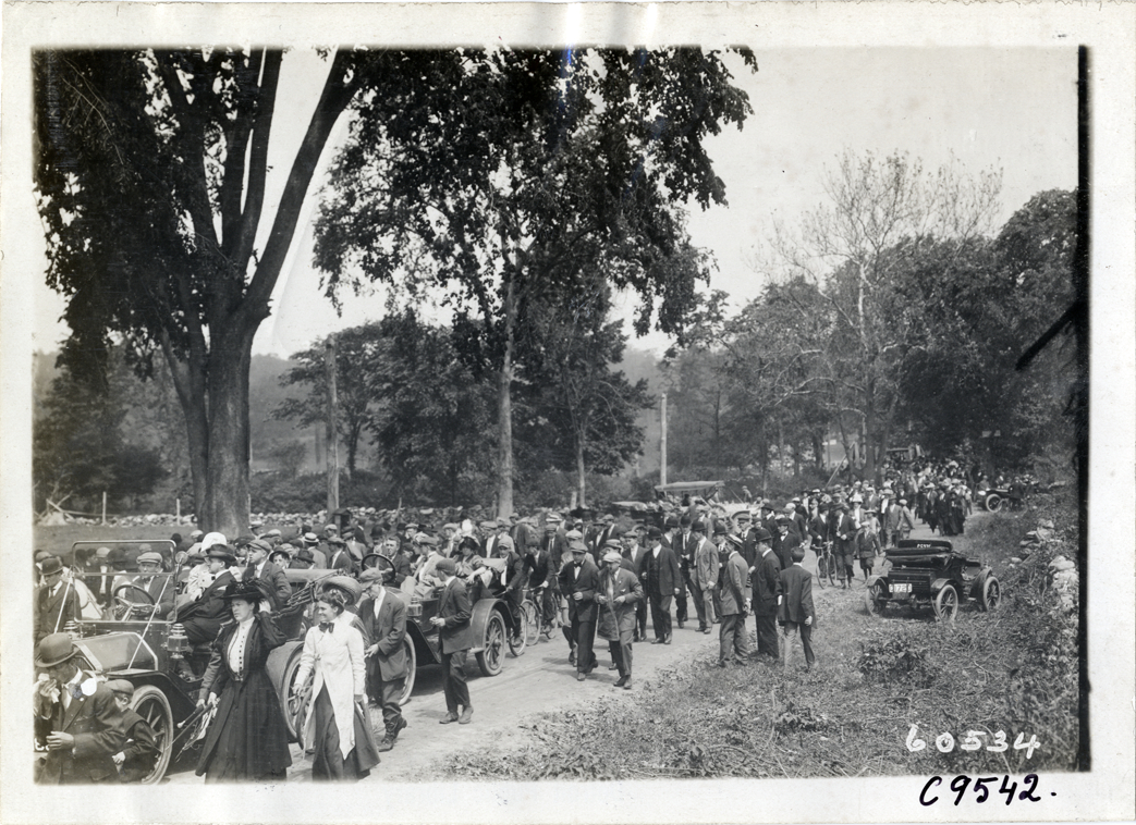 Spectators and automobiles at 1910 Bridgeport Hill Climb at Sport Hill, Connecticut