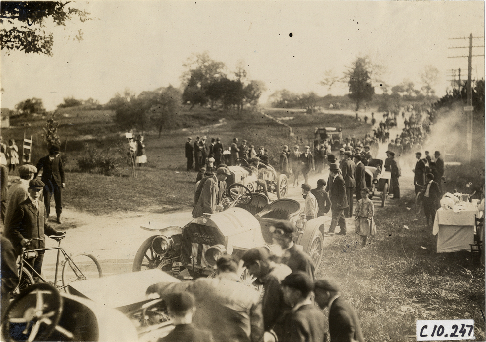 View of starting area at 1909 Shingle Hill Climb in West Haven, Connecticut. Racecars and boy with bicycle in foreground. Spectators gather on roadside. Stamped on back: "Spooner & Wells, Inc., photographers, telephones 3472-3473 Columbus, 1931 Broadway, New York." Handwritten on back: "Hill Climbs--Shingle Hill Climb, 1909. General view at start of Shingle Hill Climb, West Haven, Conn., 5/26-09."