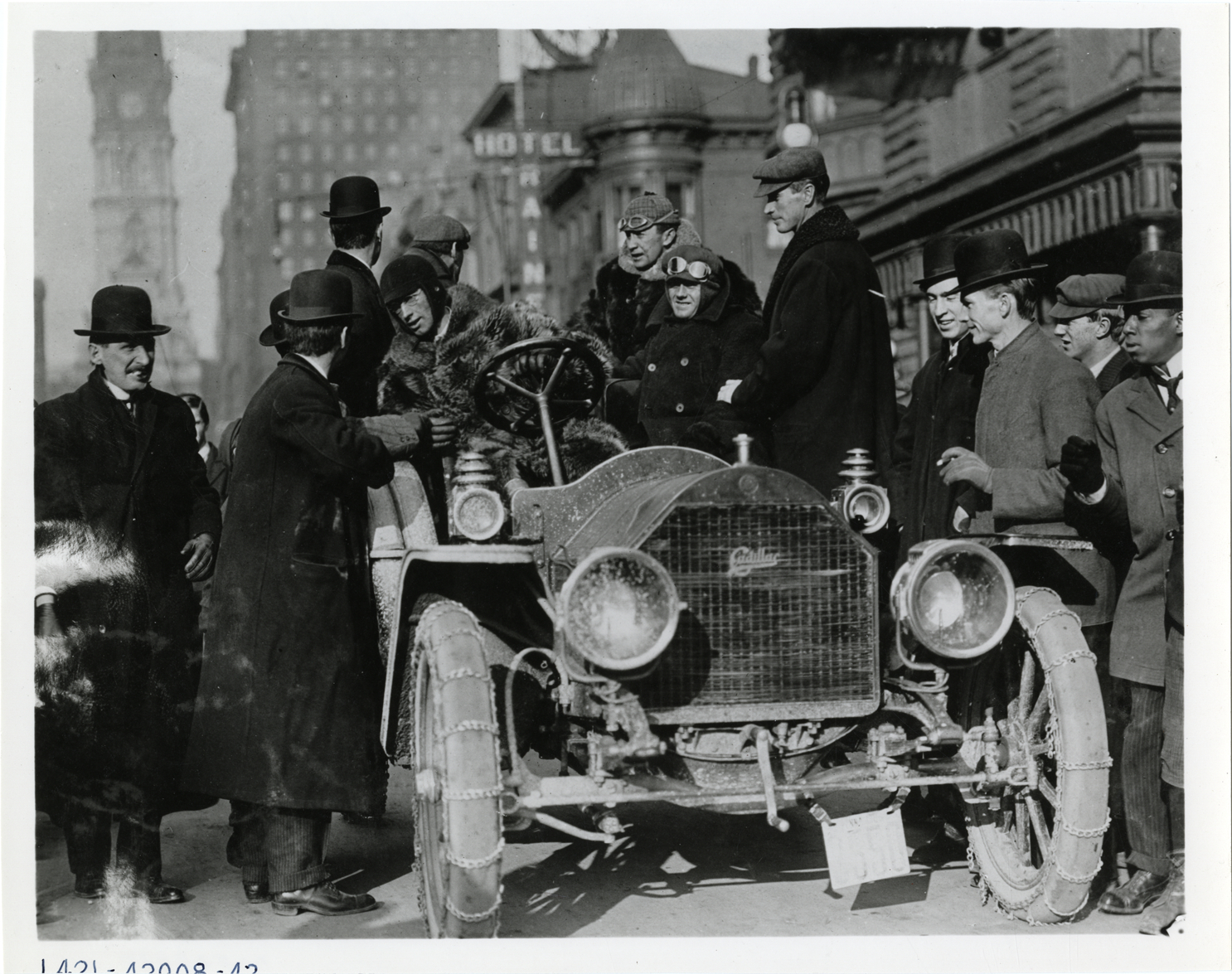 View of group of men surrounding driver and passenger in Cadillac car. Driver wears fur coat; chains on front tires. Handwritten on back: "Cadillac."