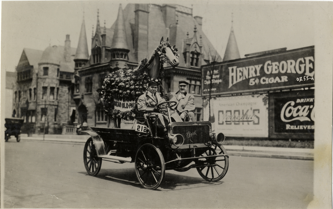 View of two motorists in Clark truck during Chicago Floral Parade. Truck carries replica of horse decorated with flowers and "Dear old pal" sign. Chateauesque style building and billboard for Henry George 5 [cent] cigar in background. Handwritten on back: "Motor trucks--Clark. Chicago Floral Parade."