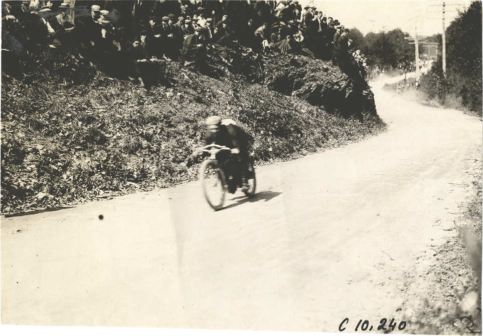 View of James F. Cox racing Indian motorcycle at 1909 Shingle Hill Climb in West Haven, Connecticut. Spectators watch from roadside. Stamped on back: "Spooner & Wells, Inc., photographers, telephones 3472-3473 Columbus, 1931 Broadway, New York." Handwritten on back: "Hill Climbs--Shingle Hill Climb, 1909. Jas. F. Cox, Indian motorcycle, winner of Class A & B events at Shingle Hill Climb, West Haven, Conn., 5/29-09. Gen. view of course."