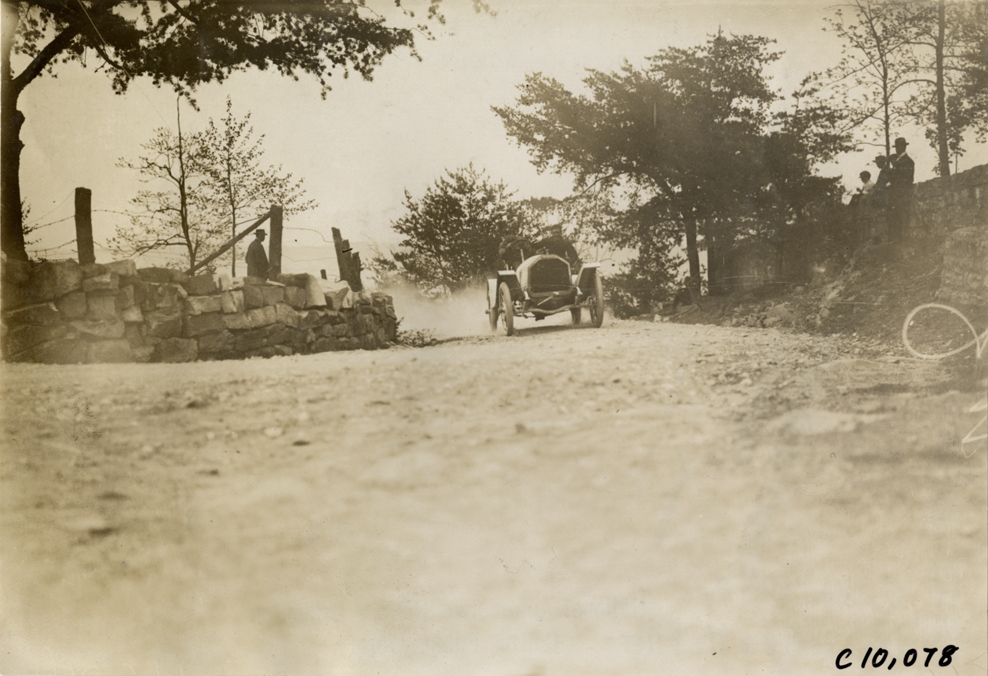 View of Louis Strang driving Buick racecar at 1909 Lookout Mountain Hill Climb in Chattanooga, Tennessee. Spectators watch from roadside. Stamped on back: "Spooner & Wells, Inc., photographers, telephones 3472-3473 Columbus, 1931 Broadway, New York." Handwritten on back: "Hill Climbs--Lookout Mountain Hill Climb, 1909. Strang, Buick."