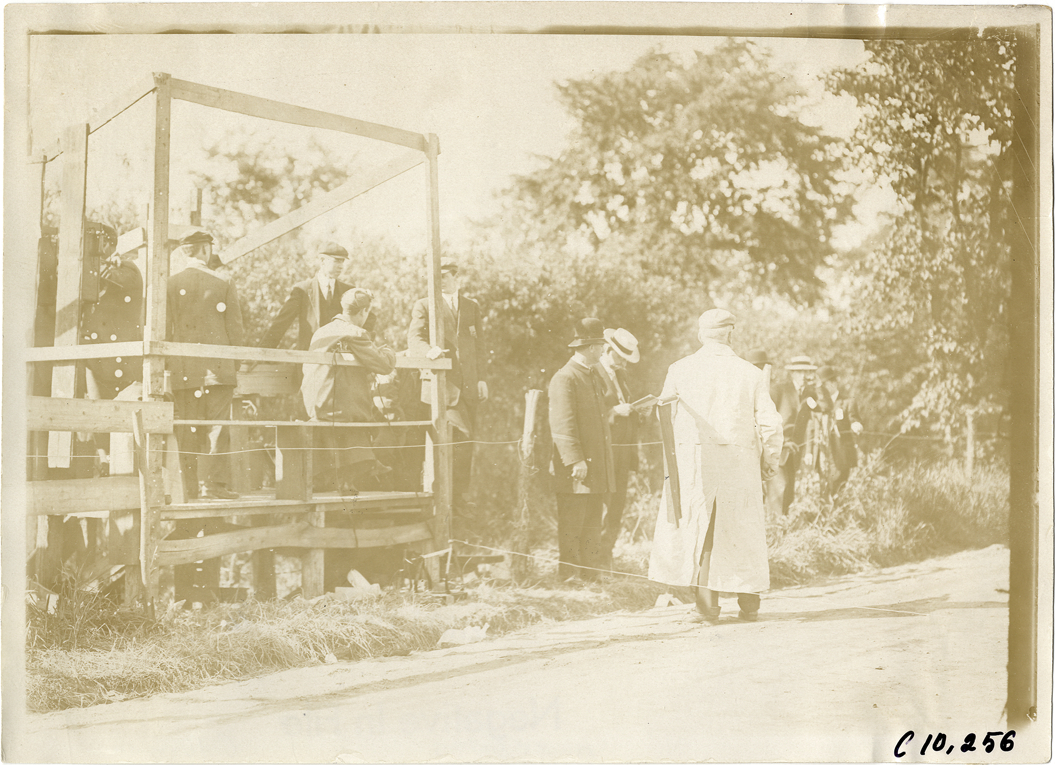 View of spectators and racing officials standing on and near reviewing stand at 1910 Shingle Hill Climb in West Haven, Connecticut. Racing official, wearing long driving coat, holds flag under one arm. Stamped on back: "Spooner & Wells, Inc., photographers, telephones 3472-3473 Columbus, 1931 Broadway, New York." Handwritten on back: "Hill Climbs--Shingle Hill Climb, 1910."