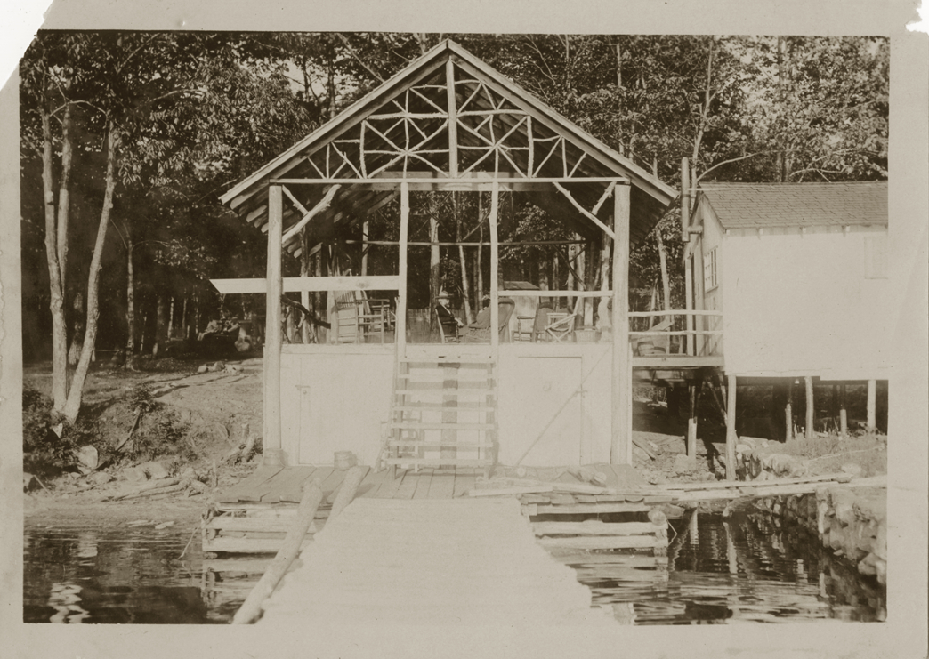 View of man sitting in rustic front-gabled waterfront pavilion. Chairs and other furniture inside pavilion; stairs lead from building to dock. Handwritten on back: "Houses."