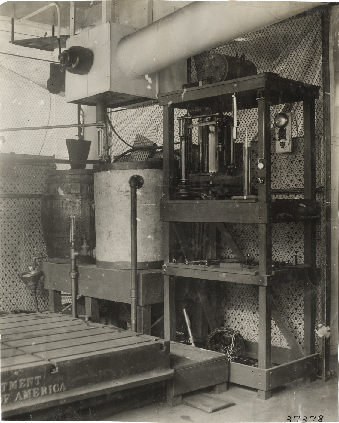 View of shelves holding assorted hand tools, beaker, weights and alarm bell. Stamped on back: "Spooner & Wells, Inc., photographers, telephones 3472-3473 Columbus, 1931 Broadway, New York." Handwritten on back: "Machinery, 1910."