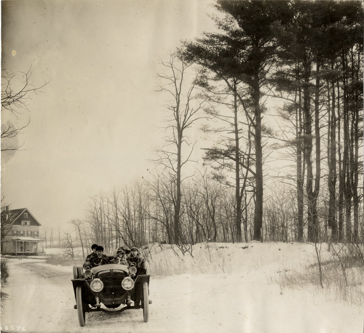 Front view of motorists in 1911 Lozier car traveling through woods on snow-covered road. House in background. Stamped on back: "Spooner & Wells, Inc., photographers, telephones 3472-3473 Columbus, 1931 Broadway, New York." Handwritten on back: "Lozier, 1911."