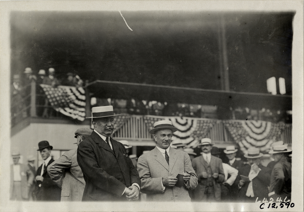 View of men at Empire City racetrack in Yonkers, New York. Grandstand decorated with bunting in background. Stamped on back: "Spooner & Wells, Inc., photographers, telephones 3472-3473 Columbus, 1931 Broadway, New York." Handwritten on back: "Horse-racing--Empire City, 1910."