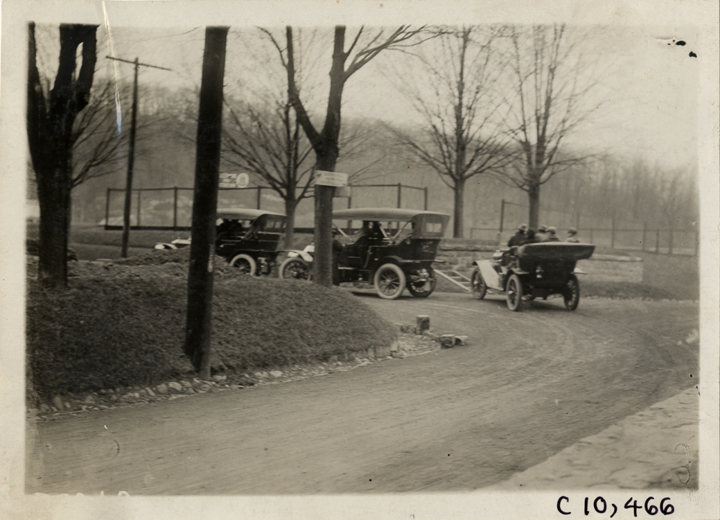 Rear view of motorists in 1910 Maxwell cars, traveling on rural road. Stamped on back: "Spooner & Wells, Inc., photographers, telephones 3472-3473 Columbus, 1931 Broadway, New York." Handwritten on back: "Maxwell, 1910."