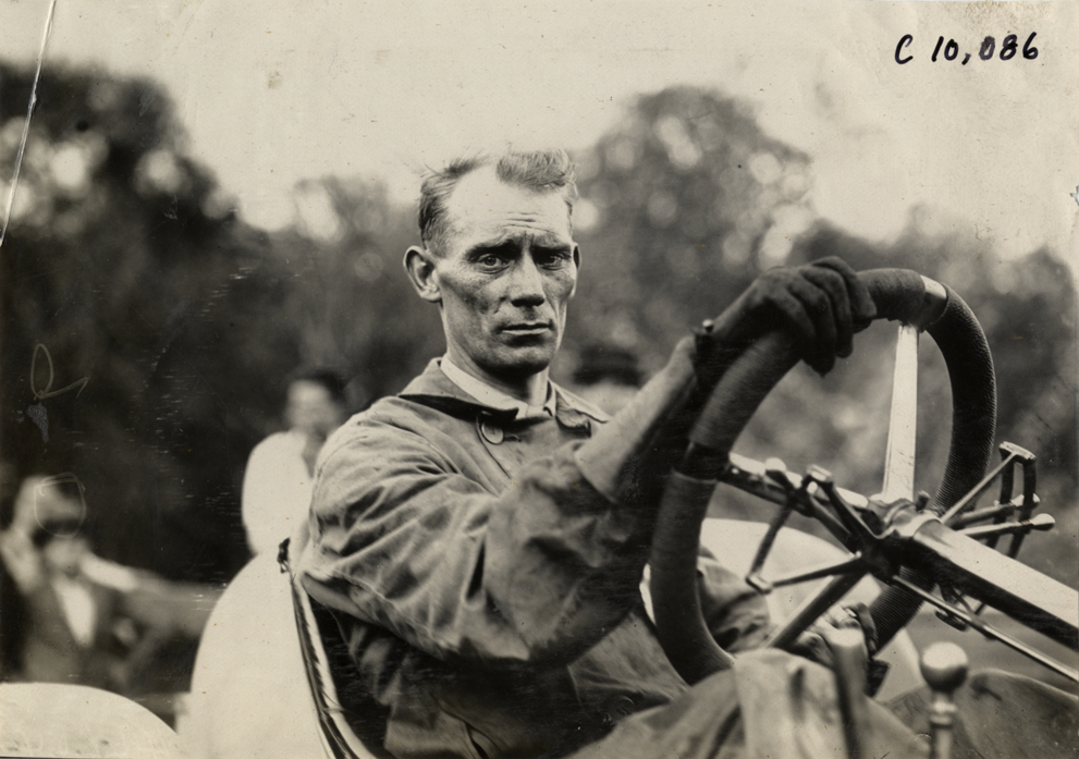 Portrait of Bert Miller in Stoddard-Dayton racecar at 1909 Lookout Mountain Hill Climb in Chattanooga, Tennessee. Stamped on back: "Spooner & Wells, Inc., photographers, telephones 3472-3473 Columbus, 1931 Broadway, New York." Handwritten on back: "Hill Climbs--Lookout Mountain Hill Climb, 1909. Bert Miller, Stoddard Dayton."
