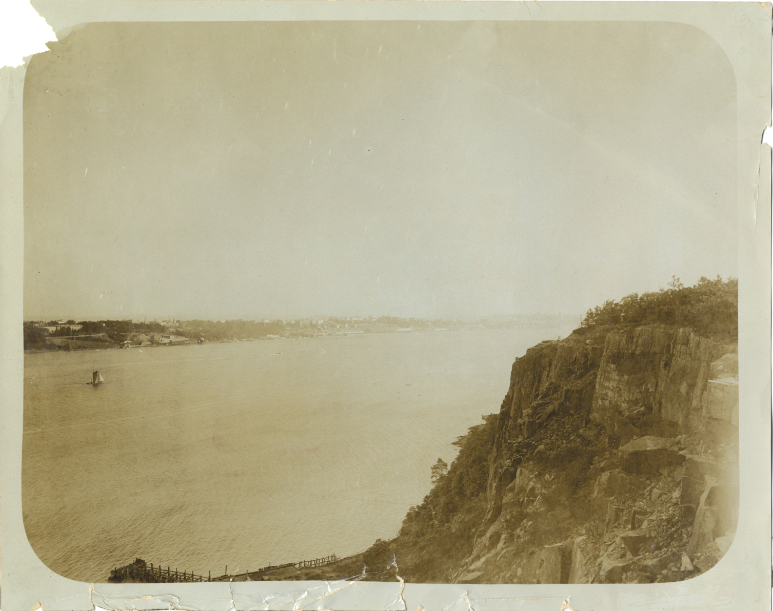 View of river; rocky outcropping in foreground. Handwritten on back: "Landscapes."