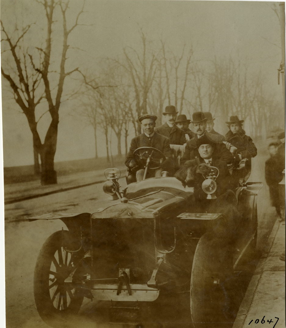 View of motorists in 1906 Maxwell car. Stamped on back: "Photo by F. Ed. Spooner, 1536 B'way, telephone 6536-38th St., New York, N.Y." Handwritten on back: "Maxwell, 1906."