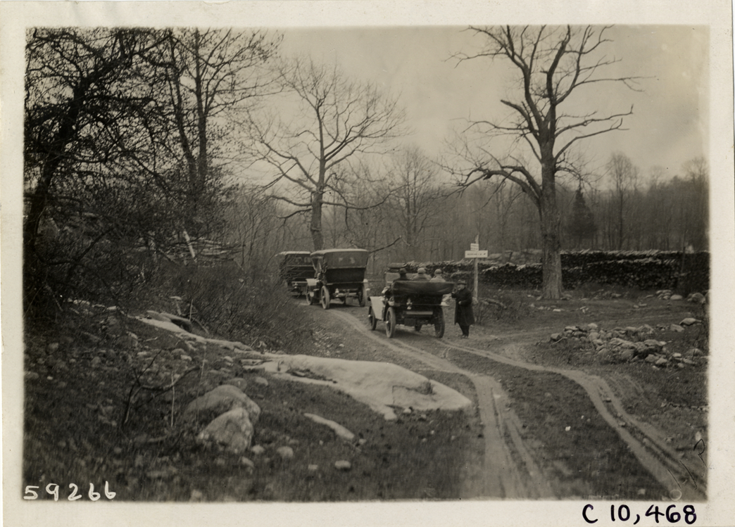 Rear view of motorists in 1910 Maxwell cars, traveling on rural road. Man standing on roadside talks to passengers in car; road sign in background. Stamped on back: "Spooner & Wells, Inc., photographers, telephones 3472-3473 Columbus, 1931 Broadway, New York." Handwritten on back: "Maxwell, 1910."