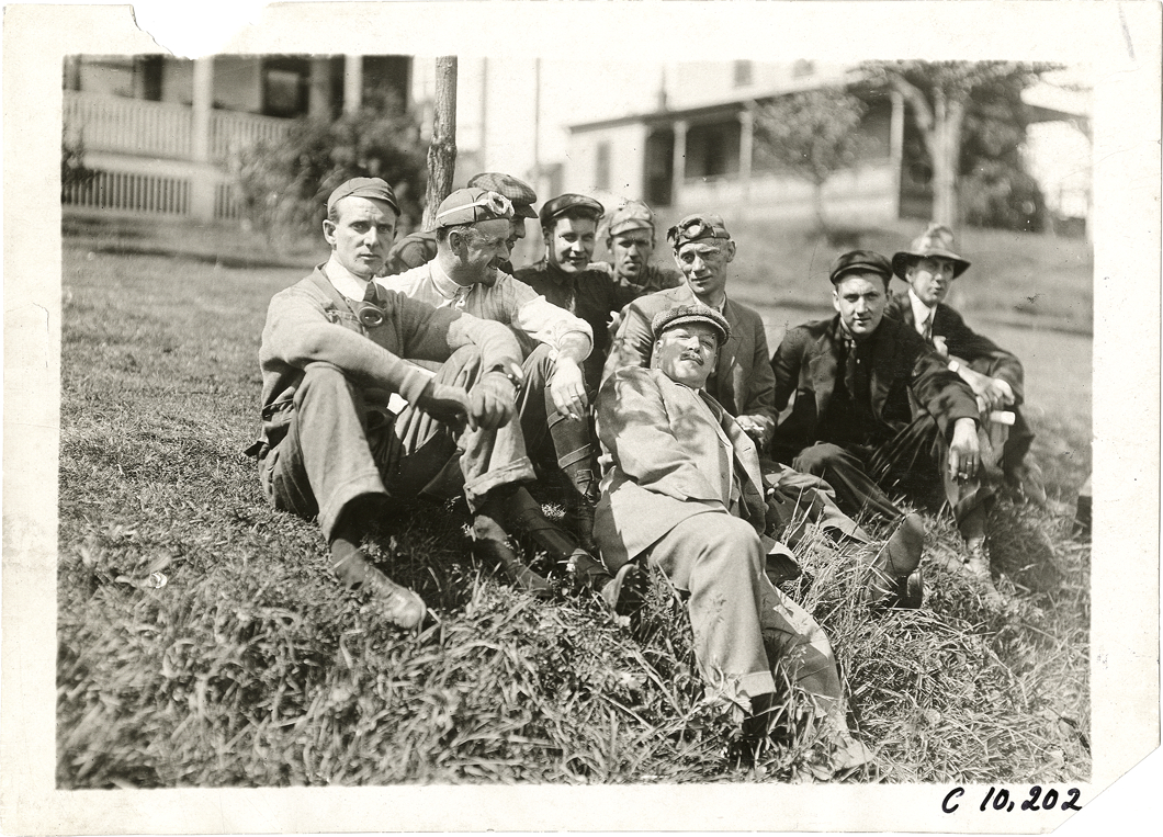 Group of men sitting on lawn, 1909 Shingle Hill Climb