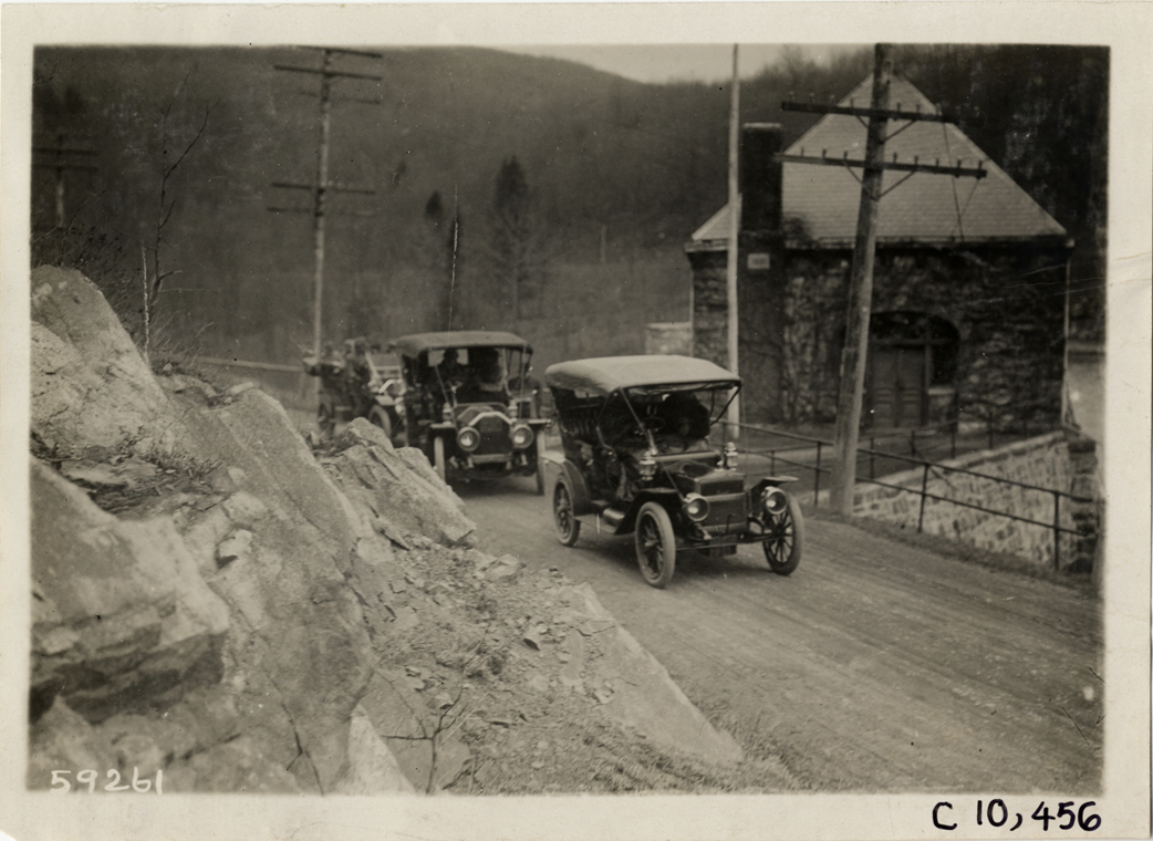 Rear view of motorists in 1910 Maxwell cars, traveling on rural road past stone building with hipped roof. Stamped on back: "Spooner & Wells, Inc., photographers, telephones 3472-3473 Columbus, 1931 Broadway, New York." Handwritten on back: "Maxwell, 1910."