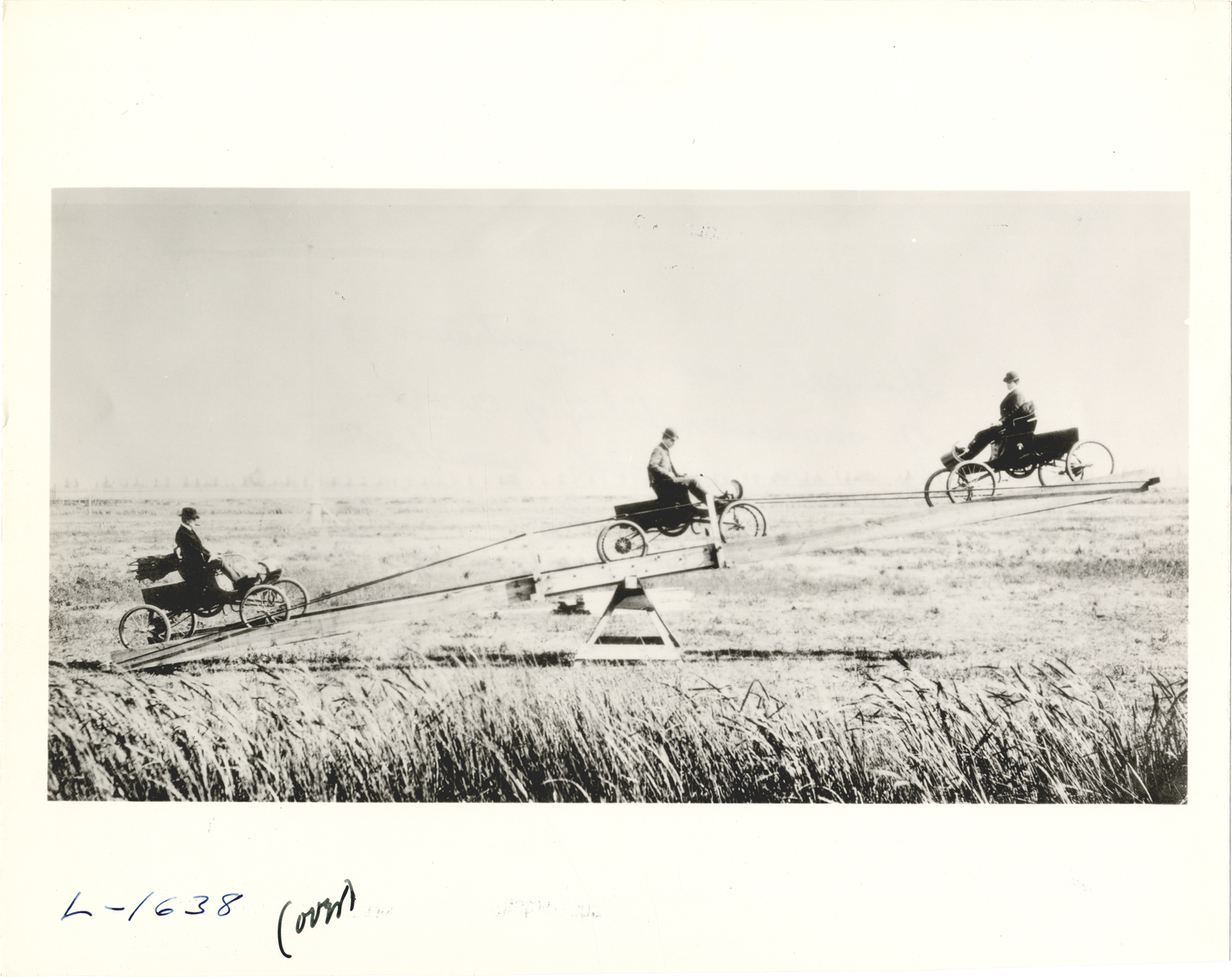 View of motorists in three Oldsmobile cars on seesaw during demonstration at Grosse Pointe track of Detroit Driving Club. Handwritten on back: "Oldsmobile, 1902 [sic]. This see-saw demonstration of maneuverability of curved-dash Oldsmobile runabout was staged at Grosse Pointe track of Detroit Driving Club in October 1901, when Henry Ford won his first race against Alexander Winton."