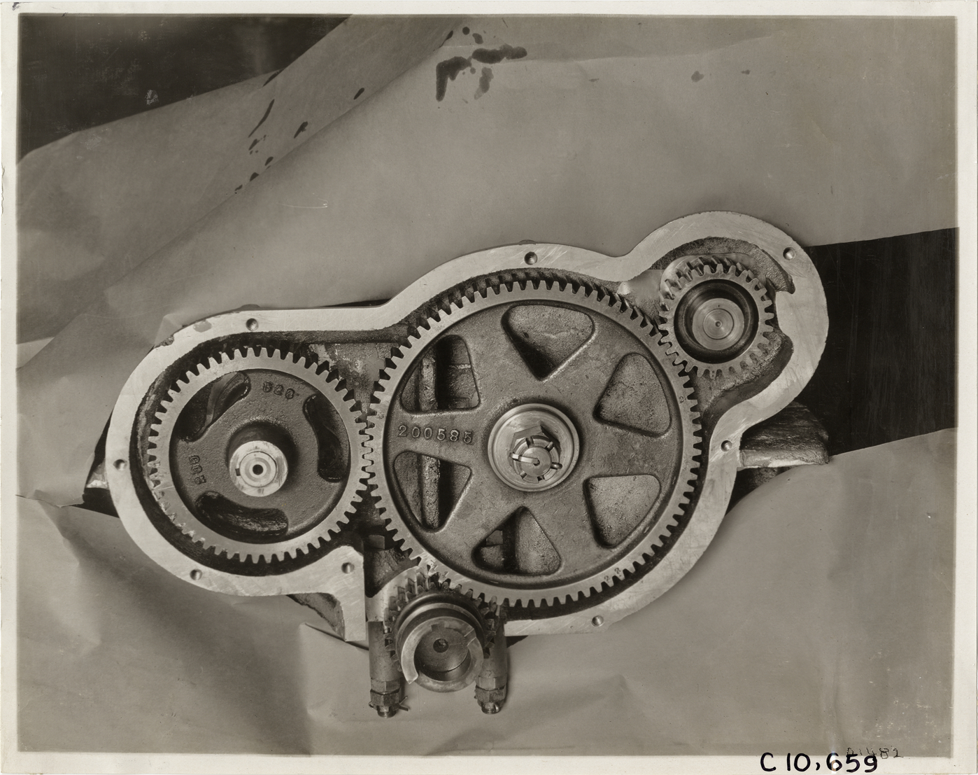 Close-up view of gear assembly for 1910 Rapid truck. Handwritten on back: "Motor trucks--Rapid, 1910."