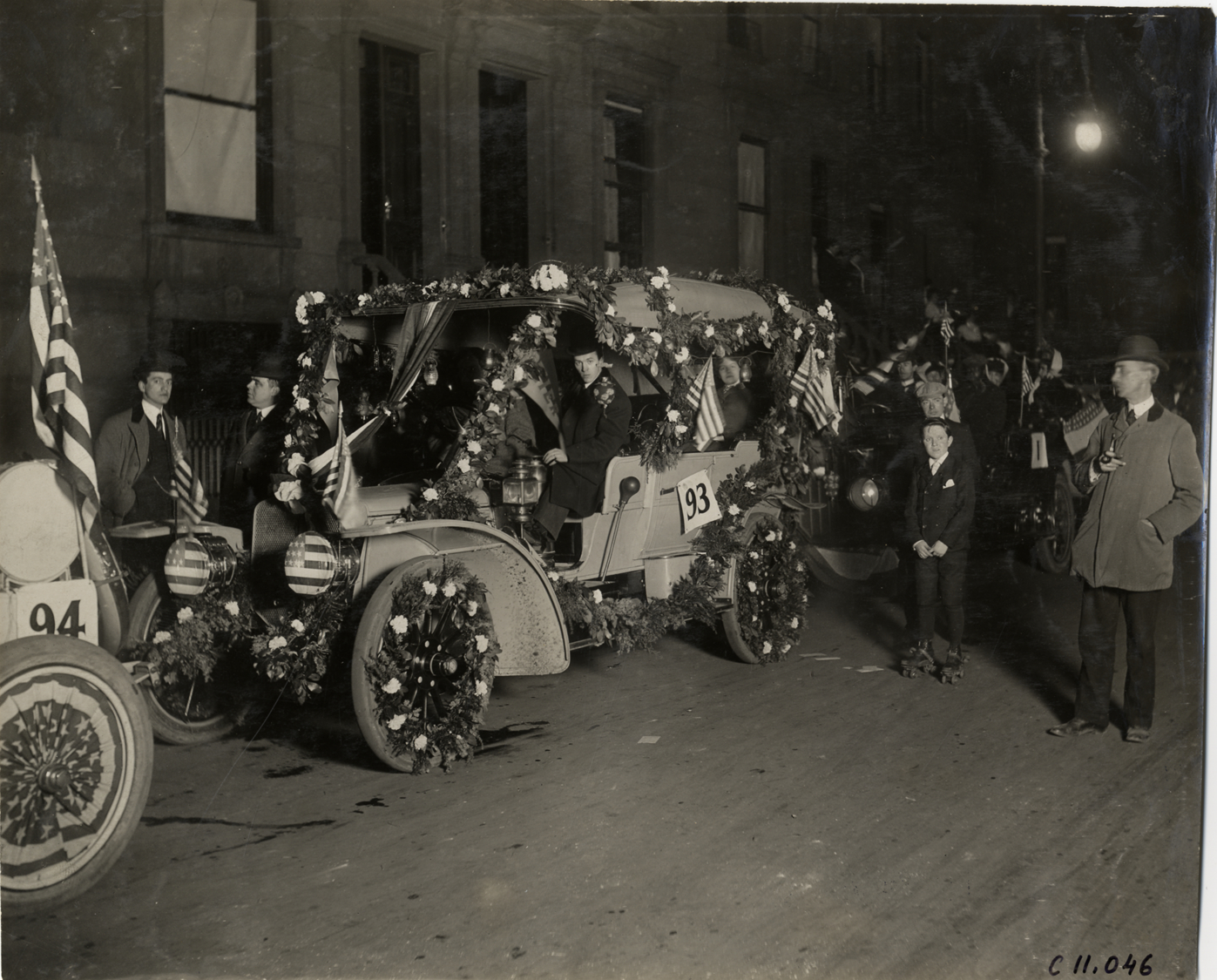 Nighttime view of men in Lozier car decorated with floral garlands for 1908 automobile carnival in New York City. Onlookers stand nearby; boy wearing roller skates on right. Handwritten on back: "Parades--Automobile Carnival, 1908. Lozier."