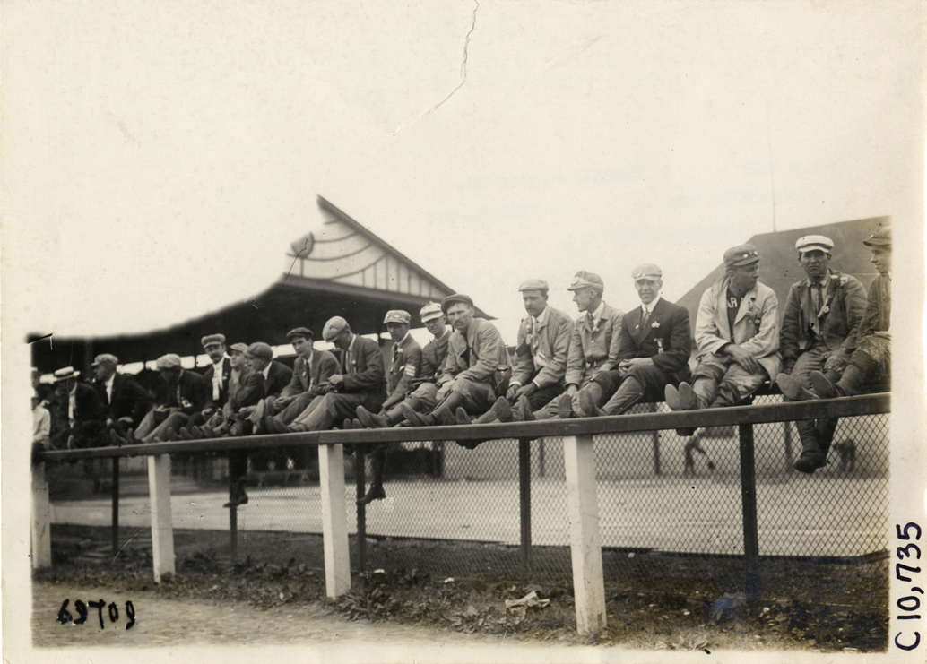 View of spectators, sitting on racetrack railing, watching motorcycle race at 1911 Federation of American Motorcyclists races in Fort Erie, Ontario. Stamped on back: "Spooner & Wells, Inc., photographers, telephones 3472-3473 Columbus, 1931 Broadway, New York." Handwritten on back: "Motorcycle races--Federation of American Motorcyclists championship races, 1911."