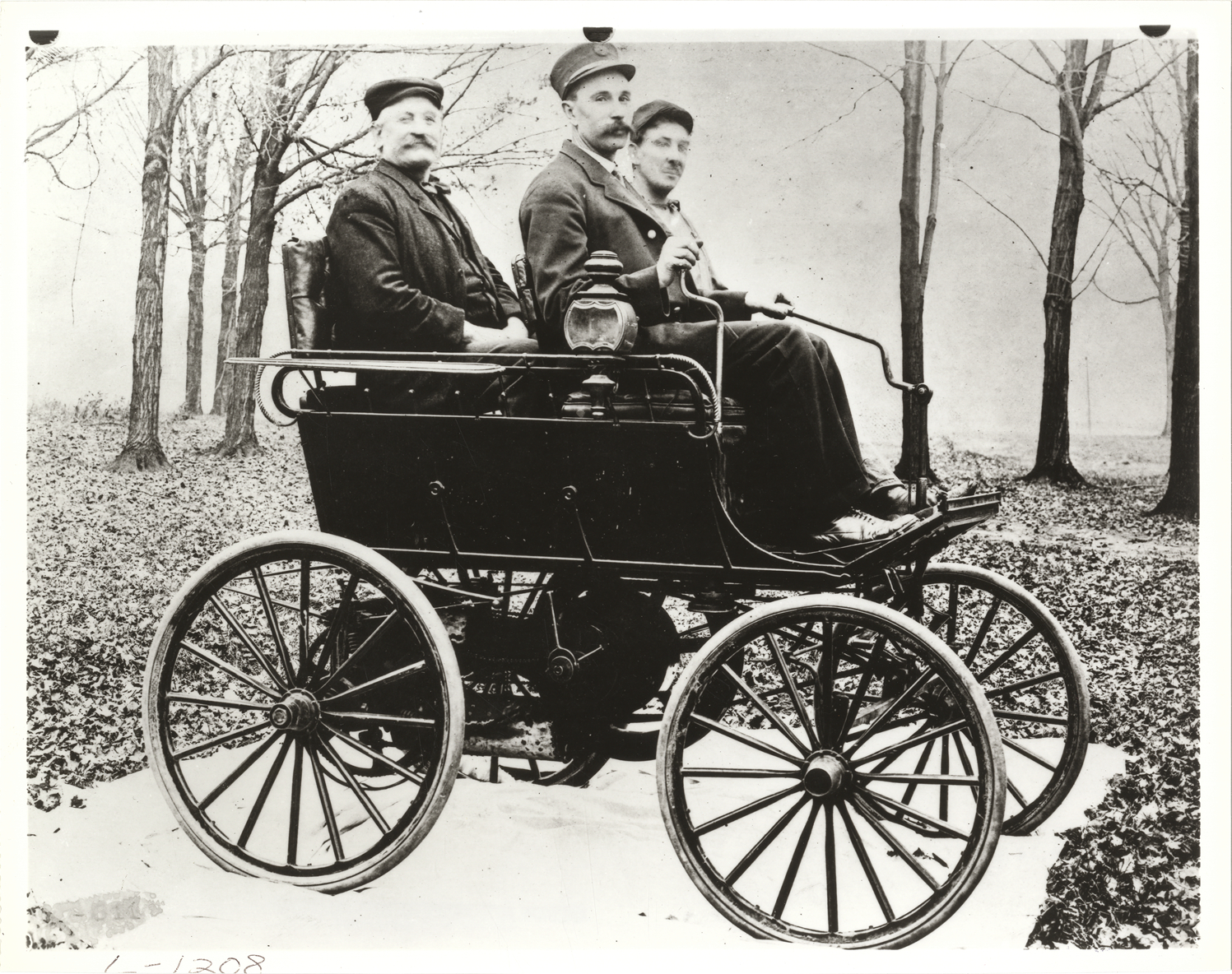 View of three men in 1897 Oldsmobile car. Handwritten on back: "Oldsmobile, 1897. First gasoline powered model."