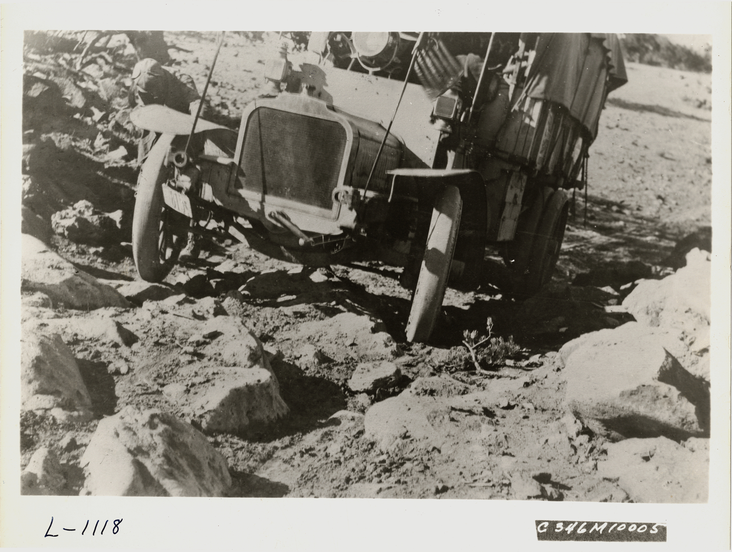Close-up view of Saurer truck traveling over rocky ground in the Mojave Desert during transcontinental trip. Handwritten on back: "Motor trucks--Saurer. Rocky paths through the Mojave Desert greeted the 1911 ocean-to-ocean truckers shortly after entering California."