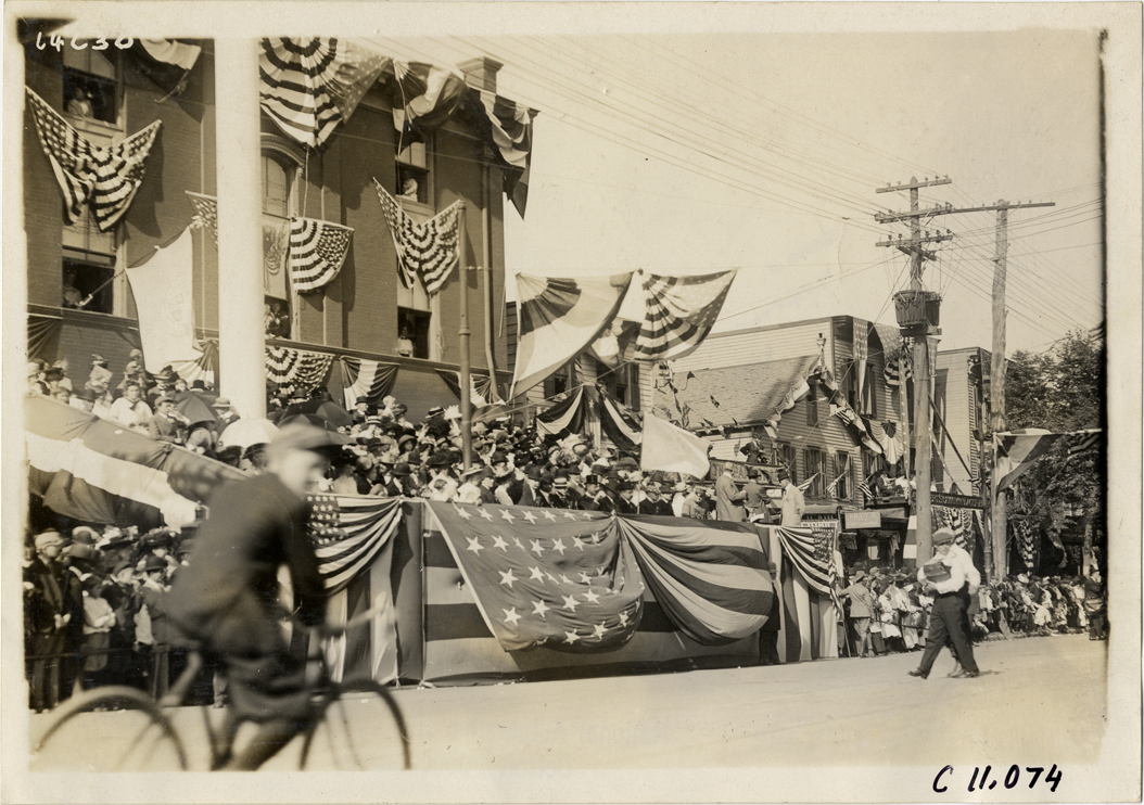 Spectators in grandstand, 1910 parade in New Rochelle, New York