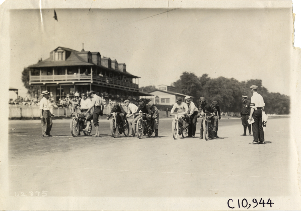 Start of motorcycle race, 1910 Point Breeze motorcycle races