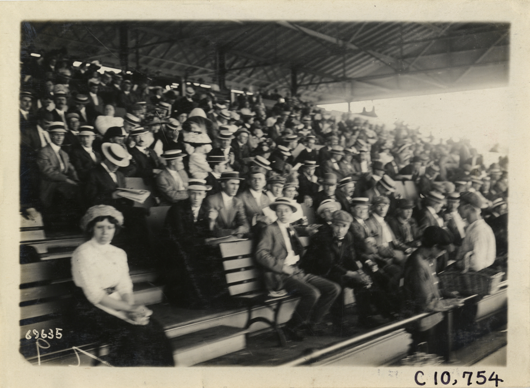Spectators in grandstand, 1911 Federation of American Motorcyclists races, Fort Erie, Ontario