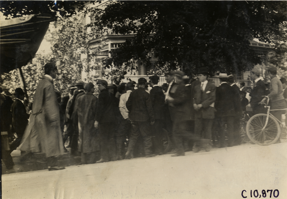 View of group of spectators on roadside at 1909 New York Motorcycle Club spring run through Brooklyn and Long Island, New York. Boy with bicycle in foreground. Stamped on back: "Spooner & Wells, Inc., photographers, telephones 3472-3473 Columbus, 1931 Broadway, New York." Handwritten on back: "Motorcycle races--New York Motorcycle Club spring run, 1909."